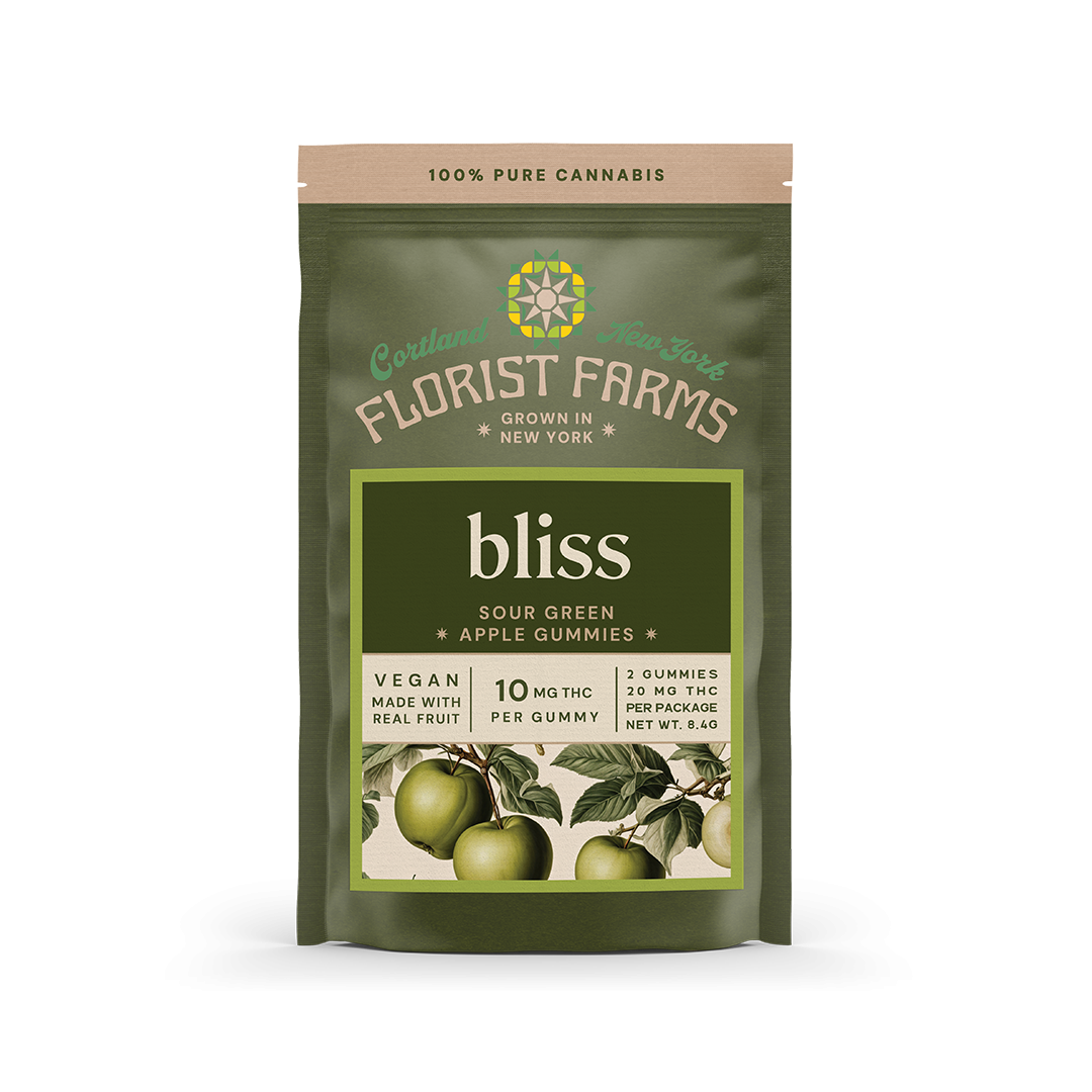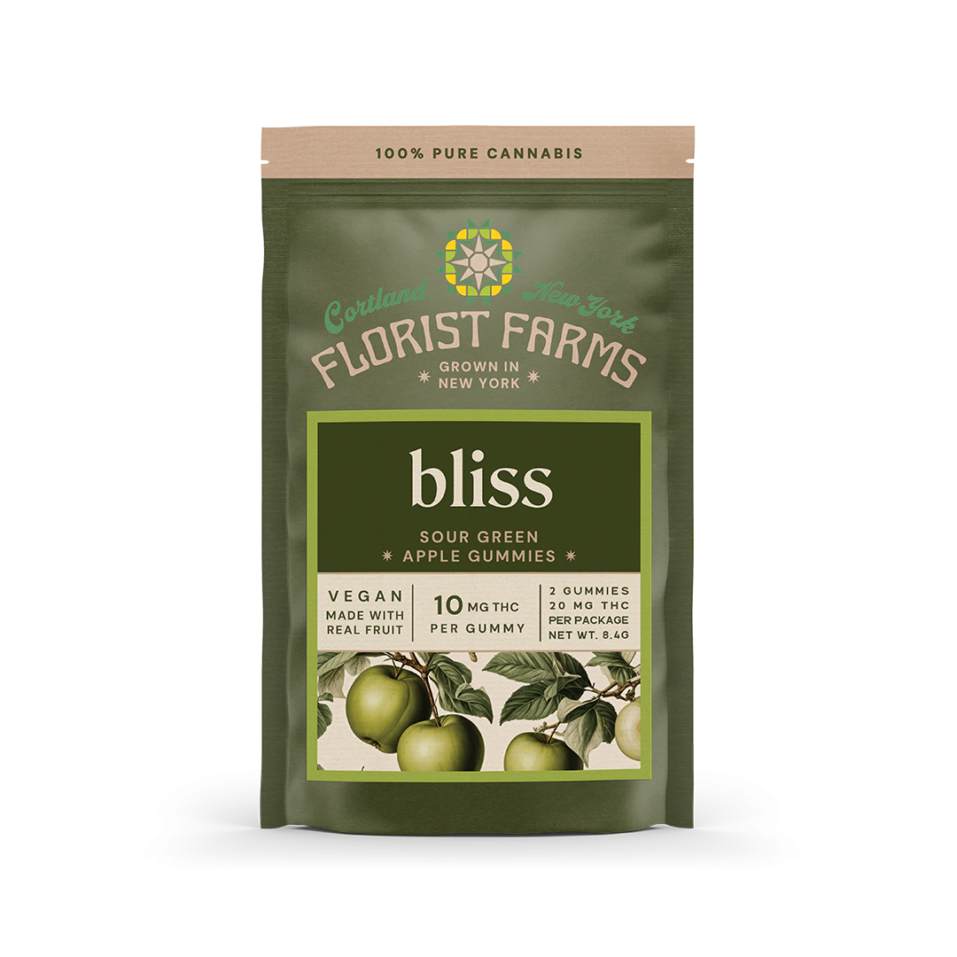 Bliss Sour Apple Gummies | 2-PackAbout This ProductThese vegan gummies are made with real fruit and organic ingredients. If you’re looking for a gummy that actually tastes good, these are a top pick. They are genuinely some of the best gummies we’ve tried. Experience the perfect high with Florist Farms' Sour Green Apple gummy. Made with real apple juice, this gummy blends tangy flavor with 10mg of THC, delivering a euphoric experience.Dose: 10mg THC per gummy (Easy to split in half for a 5mg dose)Quantity: 2 GummiesFlavor: Tart and tangy sour appleEffects: Balanced, easy, euphoric highIngredients: Organic Tapioca Syrup, Sugar, Water, Organic Juice Concentrate, Fruit Pectin, Natural Flavoring, Citric Acid, Sodium Citrate, THC Distillate, Malic Acid, Natural Colors, Organic Sunflower OilWhy We Love Florist Farmslocated in Cortland, NY, Florist Farms is committed to sustainability. They practice regenerative farming by growing in living soil, using organic compost, and never use pesticides. For over a decade they have been organic vegetable farmers and donate produce weekly to help support their community. Our friends at Florist Farms are deeply committed to quality and to delivering the cleanest cannabis products in New York State.Vegan • No Artificial Flavoring or Dyes • No Corn Syrup • Dairy Free • Gluten Free • Soy Free • Tree-Nut Free • Coconut Free