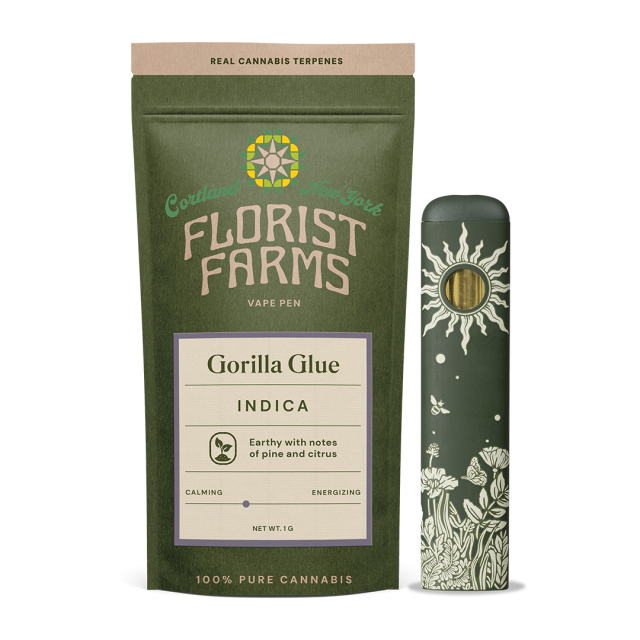 Gorilla Glue | Indica| 1G All-In-OneAbout This ProductIf you’re looking for a vape that actually tastes like cannabis, this is it - no fake flavors, just real, pure cannabis that hits smooth every time.Effect: IndicaFlavor: Earthy with notes of pine and citrusIngredients: 100% Pure Cannabis Oil and Cannabis TerpenesWhy We Love Florist FarmsLocated in Cortland, NY, Florist Farms is committed to sustainability. They practice regenerative farming by growing in living soil, using organic compost, and never using pesticides. For over a decade, they have been organic vegetable farmers and donate produce weekly to help support their community. Our friends at Florist Farms are deeply committed to quality and to delivering the cleanest cannabis products in New York State.100% Pure Cannabis • No Artificial Flavoring • No Botanical Terpenes • Zero Cutting Agents • USB-C Rechargeable
