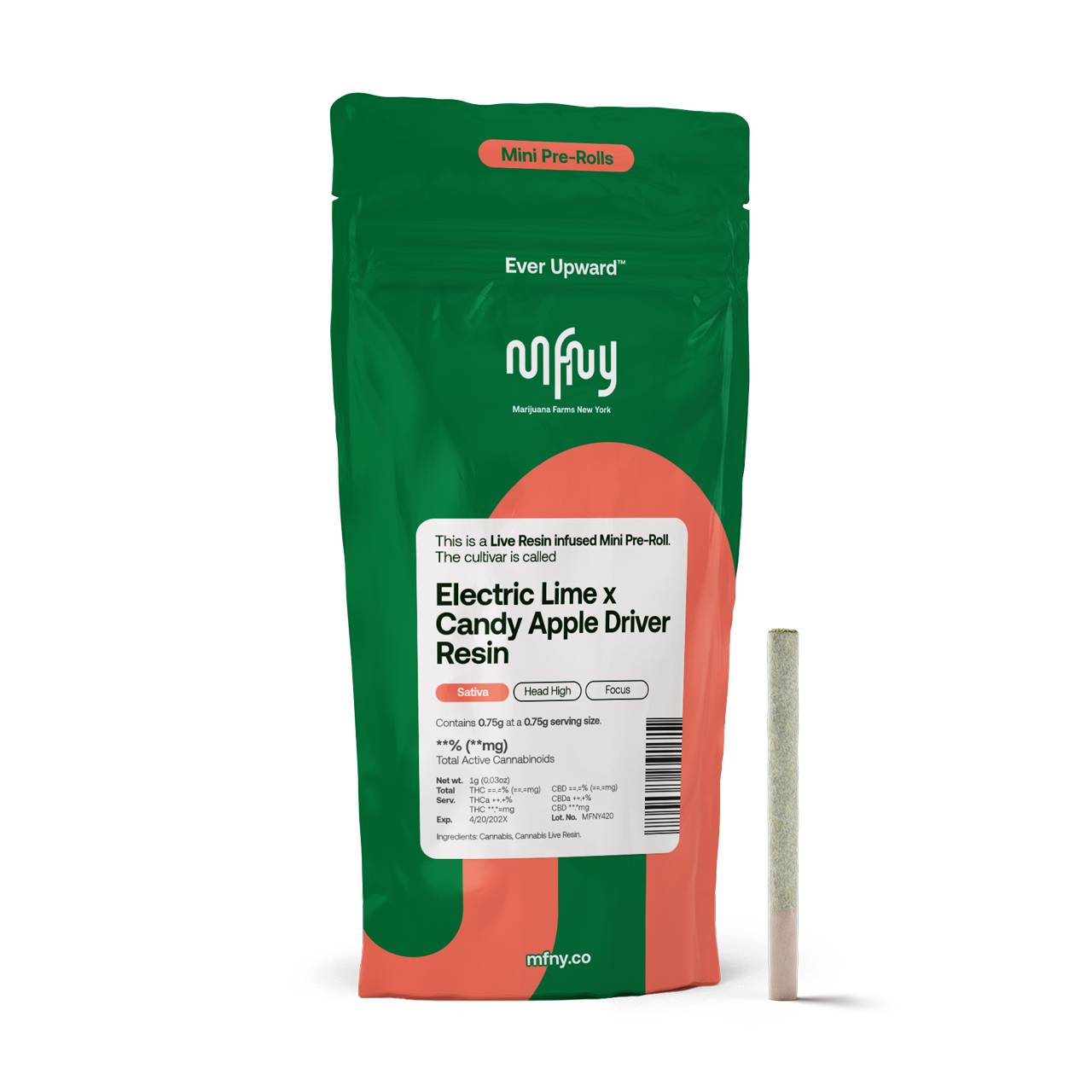 For our resin infused pre-rolls, we start with premium, hand-trimmed whole Electric Lime flower then infuse it with our in-house made Candy Apple Driver live resin HTFSE (High Terpene Full Spectrum Extract from fresh frozen buds) totaling three quarters of a gram in weight. This process creates a higher potency, flavorful product with the best of two cultivars: Electric Lime recalls flavors of tantalizing blueberry funk and undertones of cherry lime citrus flavors, paired with the candy sour apple flavor with putrid undertones from the Candy Apple Driver cultivar. Potent and high in THC, this product is a treat for experienced cannabis consumers. No shake, no trim. Just the very best of our craft cannabis, ready to enjoy. Exclusively single-sourced at MFNY in the Hudson Valley
