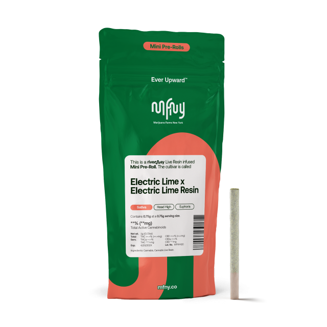 For our resin infused pre-rolls, we start with premium, hand-trimmed whole Electric Lime flower then infuse it with our in-house made Electric Lime live resin HTFSE (High Terpene Full Spectrum Extract from fresh frozen buds) totaling three quarters of a gram in weight. This process creates a higher potency, flavorful product, with an enhanced tantalizing blueberry funk and undertones of cherry lime citrus flavors from the Electric Lime cultivar. Potent and high in THC, this product is a treat for experienced cannabis consumers. No shake, no trim. Just the very best of our craft cannabis, ready to enjoy. Exclusively single-sourced at MFNY in the Hudson Valley.