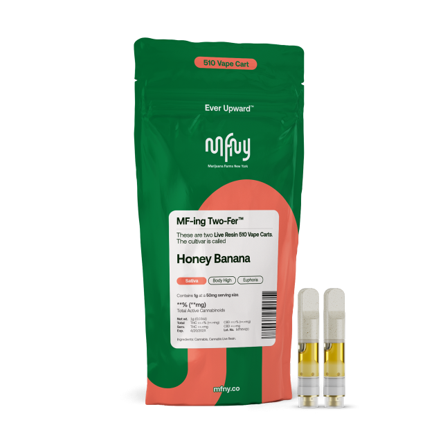 MF-ing Two-Fer: We're now offering two 1/2g carts in one bag. Why? Pouring less oil into each cart means we can preserve more of the plant's full spectrum cannabinoids, remarkable natural terpenes and fuller flavor. Not only that, the Two-Fer is better value and more of our single-source, in-house produced Honey Banana real live resin: the unmistakable banana aroma of Strawberry Banana is well balanced with sweet flavor of Honey Boo; known to promote emotional balance and uplifted mood with long lasting, invigorating cerebral effects.For our real live resin we start with fresh-frozen flower buds, then use the hydrocarbon extraction method (plus years of experience and scientific precision) to delver the purest plant extract. No distillates, added flavors, or alterations