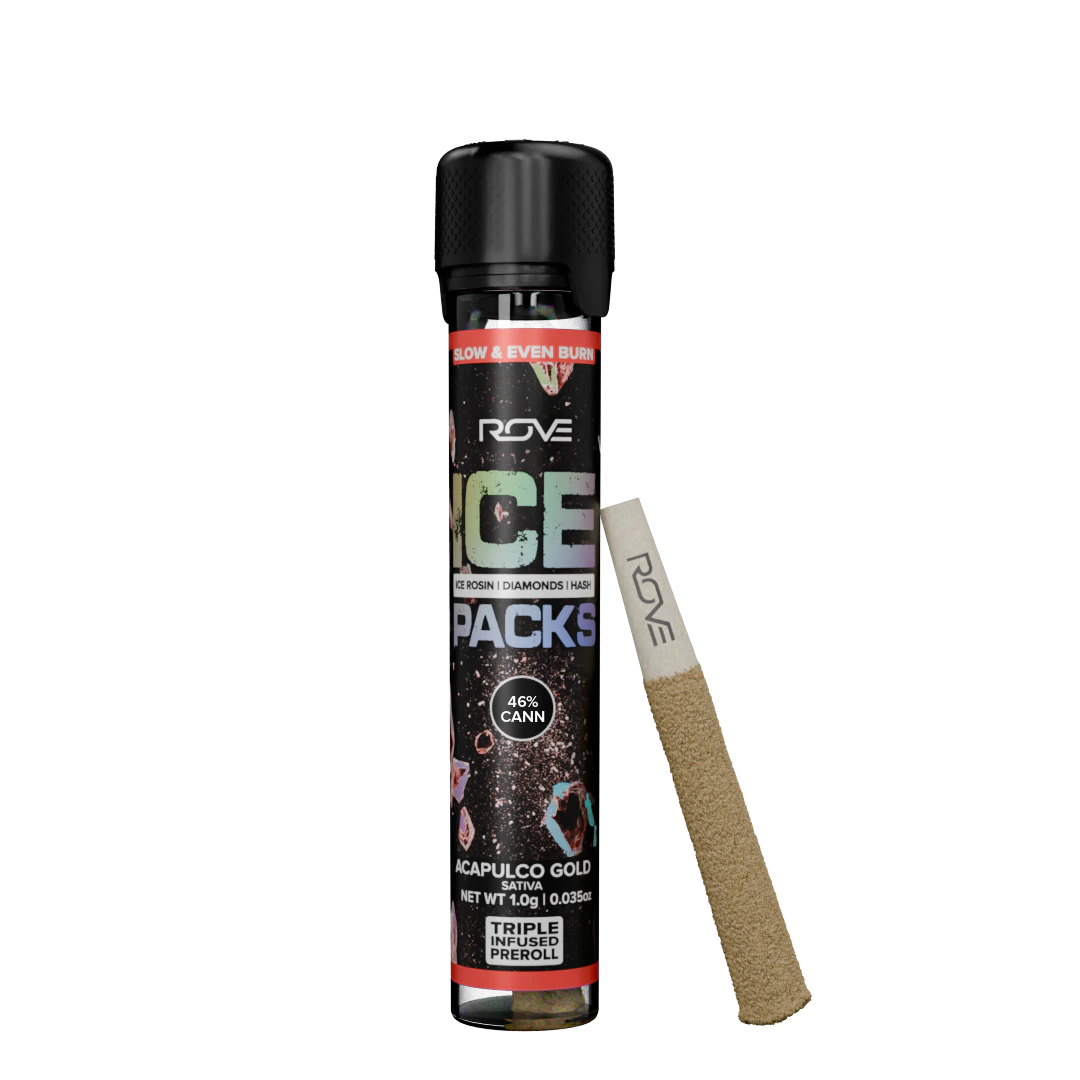Rove Ice Packs, the world’s first triple-infused preroll. Made with premium-grade flower fully-infused with THCA diamonds and solventless ice hash rosin then they're expertly rolled. Super smooth and ultra potent, Rove Ice Packs test up to 40% THC. Welcome to the next evolution of prerolls. With its unique flavor profile of sweet and earthy notes, this rare sativa marijuana strain is the perfect choice for cannabis connoisseurs looking for an energizing yet calming escape.